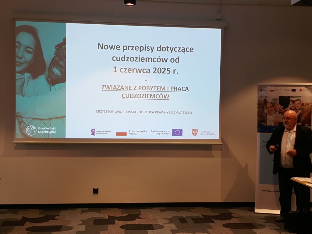 Po krótkim omówieniu aktualnie realizowanych przez DPM projektów przez koordynatorkę Centrum Integracji Cudzoziemców w Pile Marta Rumińska-Żerebiło, doradca prawny i obywatelski Krzysztof Wróblewski przybliżył uczestnikom nowe przepisy dot. legalizacji pobytu i pracy cudzoziemców.